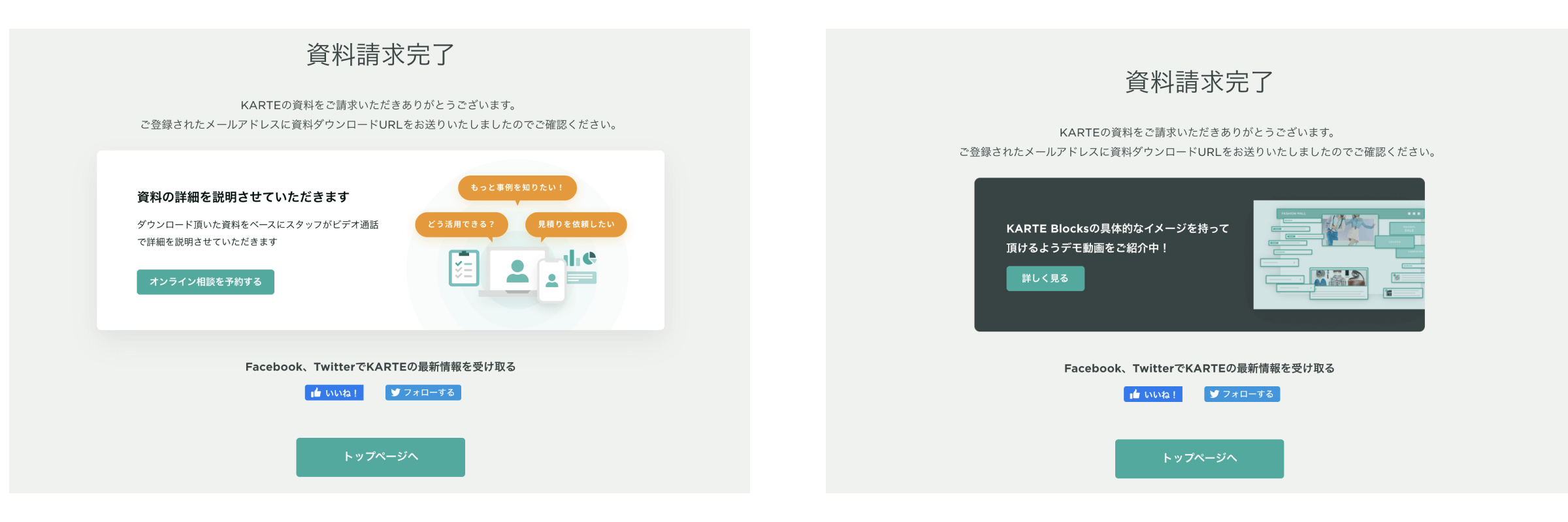 資料請求後のThanksページは、別プロダクトの資料をダウンロードしても同一ページに遷移するため、直前に閲覧していたページを元にThanksページの中央部のみをKARTE Blocksで書き換えました。このことにより、KARTEの案内ページを見ていた人にはKARTEの情報へ、KARTE Blocksを見ていた人にはKARTE Blocksの情報へ誘導することができました。