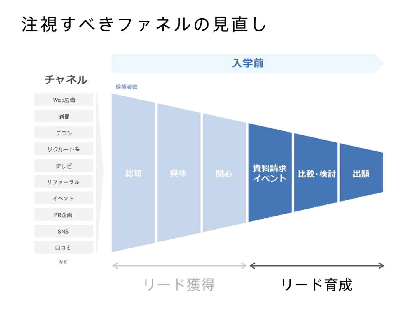 結論として、ファネルの中でも認知・興味・関心といったリード獲得のステージを注視するのをやめ、リードを育成する方向、つまり一度接点を持ったユーザーを資料請求から比較検討、出願へと大事に育てていく、ということに決めました。
