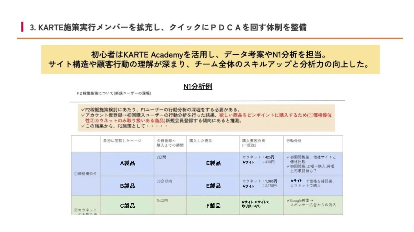 宮沢:実際、去年うちの部署に異動してきたメンバーは、ウェブマーケティングに関する業務をほとんど知らない状態でした。そこでまずはKARTEのユーザーストーリー、行動チェーン(β)などの機能でお客様の行動をさっと見てもらったんです。すると「登録しても買わない人って意外といるんですね」とか、「主にコピー用紙やクリアホルダーのような事務用品が売れ筋なんですね」といった気づきを自分でつかんでくれて。