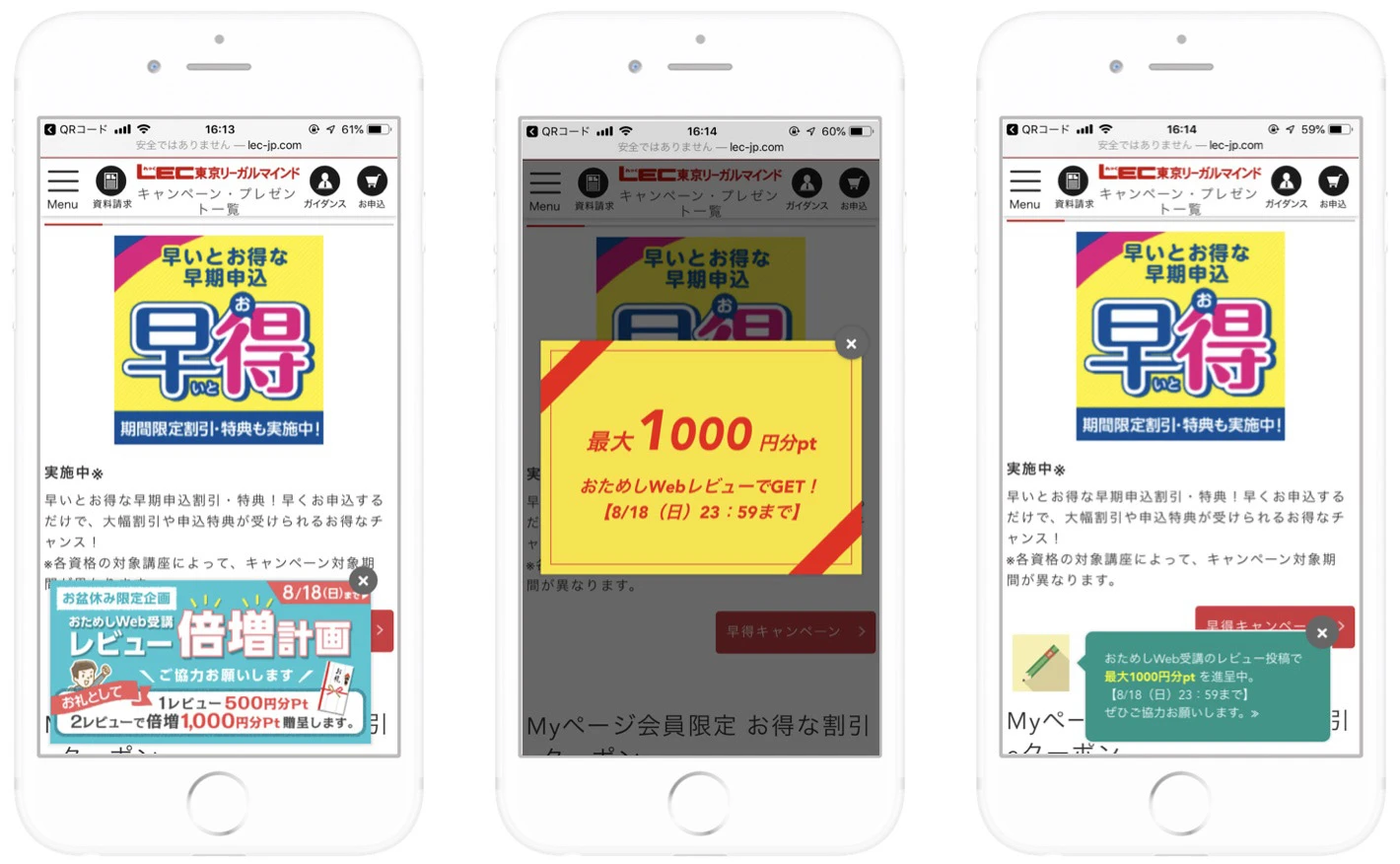 キャンペーンポップアップバナーイメージ。複数クリエイティブのABテストを行なっている。