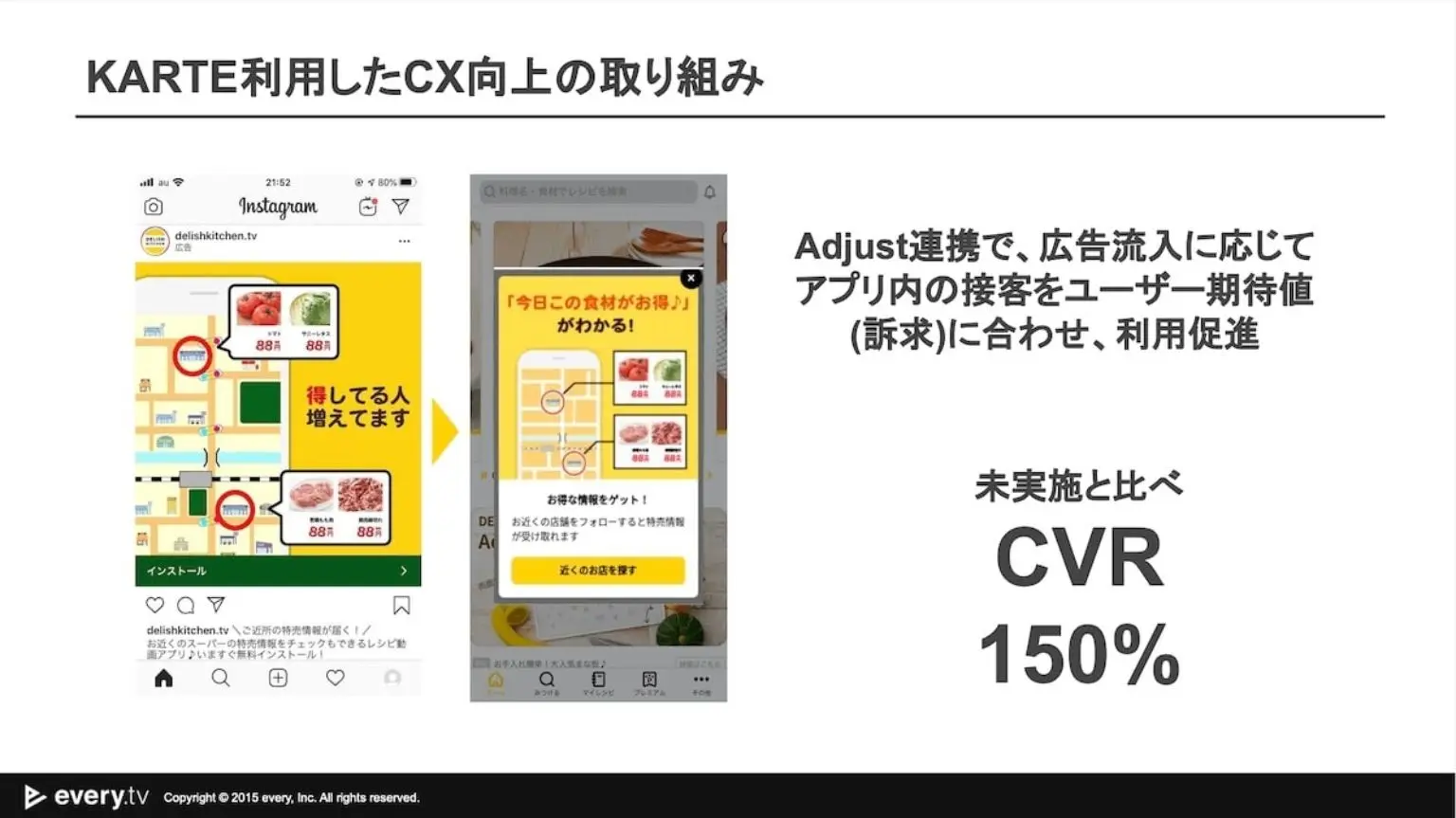 例えば、ユーザーは様々な「期待」を抱いてアプリをインストールしますが、いざアプリを開いたときに、期待に合った機能にたどり着けていないことがわかりました。これを受けて、広告流入の場合は流入元の広告で紹介した機能に早くたどり着くためのポップアップを表示、広告ではないオーガニック流入の場合はアンケートでニーズを把握し機能を提案。様々な機能があるなかで、ユーザーが必要としている可能性の高い機能の利用を促しました。