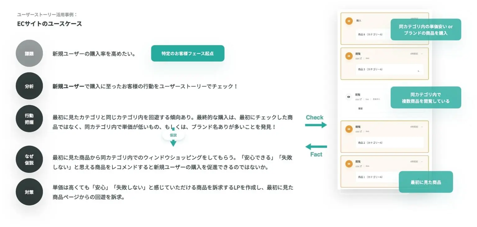あるECサイトでは、新規ユーザーの購入率を高めるため、新規ユーザーで購入に至ったお客様のユーザーストーリーをチェック。初回に購入する商品の傾向を掴むことができたため、理想とする行動をとってもらえるような施策を実施しました。