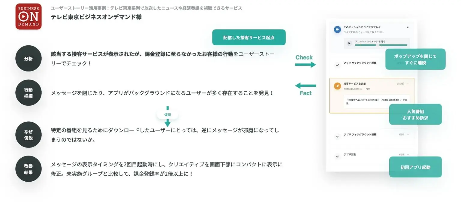 テレビ東京ビジネスオンデマンド様では、課金登録を訴求する接客サービスが表示されたが、課金に至らなかったお客様のユーザーストーリーをチェック。その結果、ポップアップを閉じる、アプリをバックグラウンドにするユーザーが多くいることがわかりました。特定の番組を見るためにアプリをインストールしたユーザーにとっては、メッセージが邪魔になってしまうのではという仮説を立て、接客サービスを改善しました。