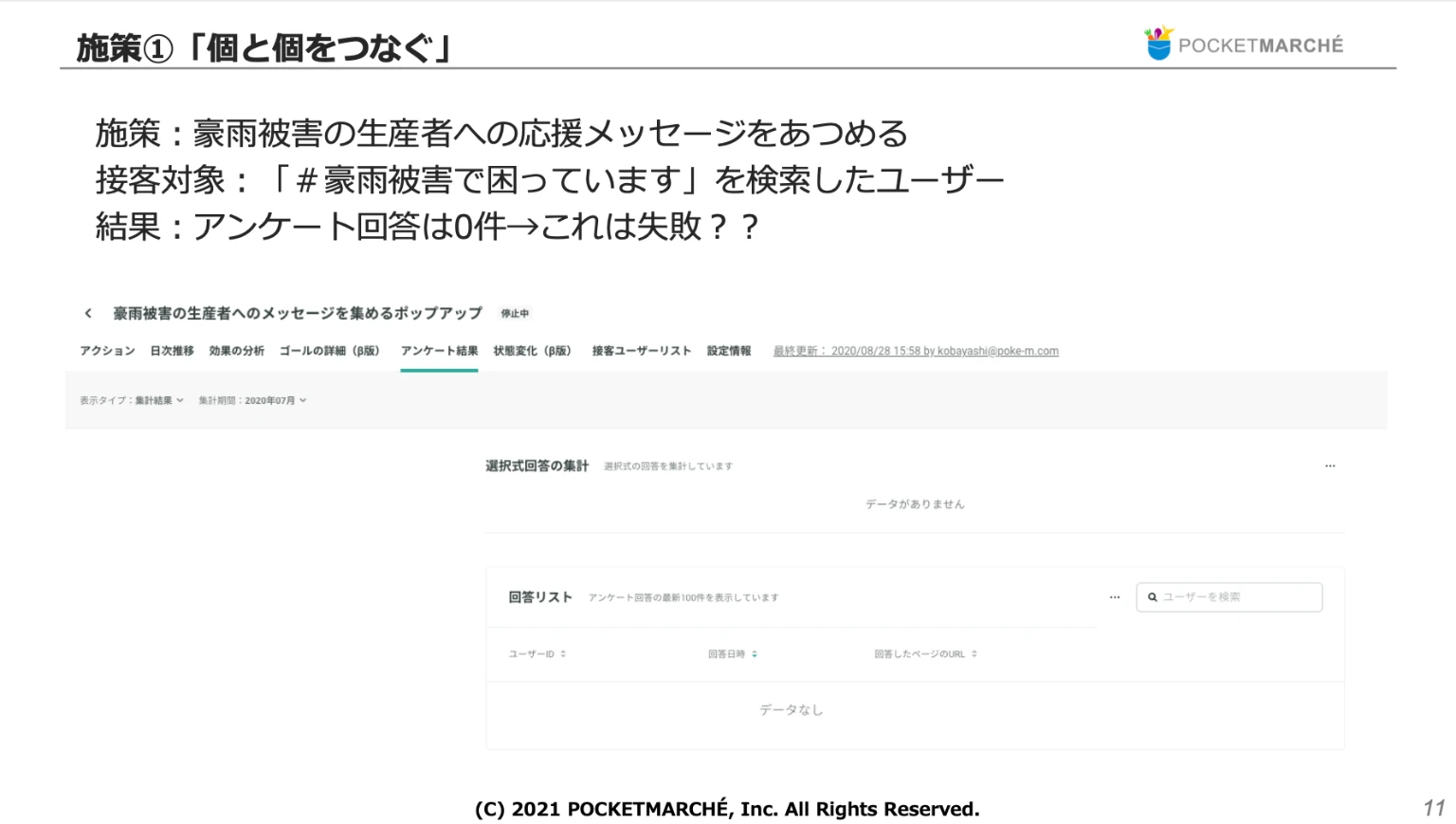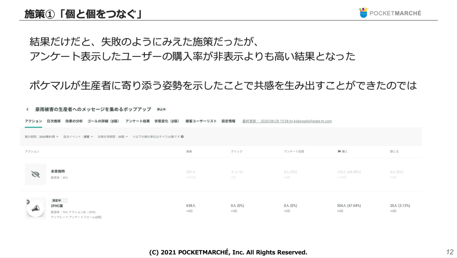 小林氏「KARTEの分析機能でデータを見ると、応援メッセージを募るためのアンケートが表示されたユーザーは、表示されていないユーザーと比較して、豪雨被害を受けた生産者の食材を購入していた比率が高いことが判明したのです。