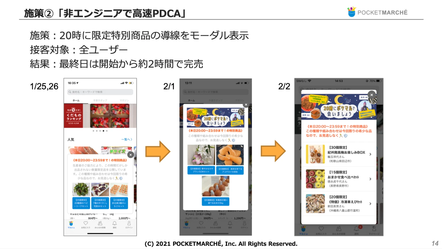 また、ユーザーにメッセージを届けるためには、反応を見ながら素早く改善を重ねることも欠かせません。小林氏は非エンジニアであってもPDCAを素早く回せたことで結果につながった事例についても触れました。